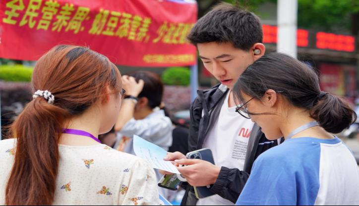南校区二食堂门口开展2024年全民营养周知识宣传活动。活动期间,林茜教授解读了“减油、增豆、加奶”核心信息,引导学生们合理搭配日常膳食,养成良好饮食习惯。现场学生协助开展营养宣传、体脂检测、有奖竞答等活动,向大学生们解读了如何通过饮食调理、合理搭配膳食,营养充足地保持健康。