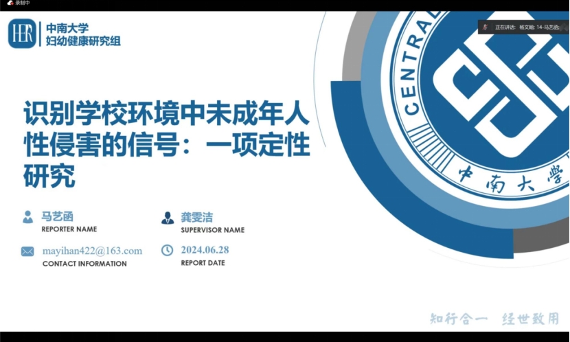 儿少系龚雯洁教授在儿童青少年心理健康专题中作《未成年人性侵害强制报告制度在学校实施的障碍分析》报告,指出当前我国中小学教职员工执行性侵害强制报告的情况并不理想,他们在如何辨识性侵行为、何时报告、如何进行上报等方面存在理解模糊,而当前制度的责任界限不清晰、指导不明确也增加了实施的障碍,制定适宜学校的实施细则可能是减少漏报和错报的关键。HER Team博士研究生马艺函在博士生线上专题以《识别学校环境中未成年人性侵害的信号:一项定性研究》为主题,围绕中国学校环境中是否存在未成年人性侵害的监测信号展开探讨,提出中小学班主任对哪些是关键监测信号以及每种信号的重要性存在分歧,需要进一步总结现有的监测模式,并制定相应措施指导学校实施有效的性侵害监测机制。