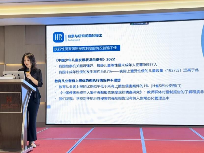 儿少系师生的三个报告如同三块拼图,构成了一个相对完整的“科研故事”,将基于学校的未成年人性侵预防这一敏感而重要的话题多角度呈现在大会上,引发了参会者的广泛的讨论。据悉,这是HER Team在邵阳地区教育系统内开展的最新课题,团队多位成员在教育局和多所中小学校进行了访谈、调查与快速人类学研究后获得的初步结果,于2023年获得了湖南省教育厅的重点立项与资助。接下来该团队将在此基础上开展基于学校的干预性研究,以期有效预防校园性侵害的发生,为未成年人撑起有效保护伞。
