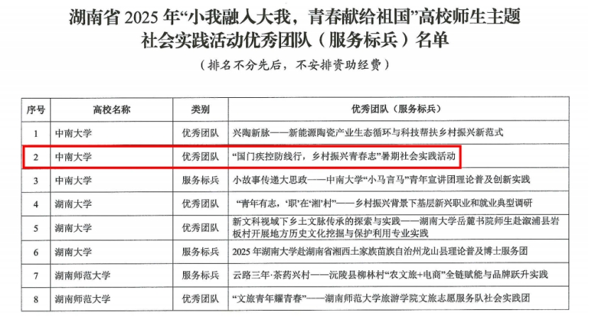 近日,中共湖南省委教育工委、湖南省教育厅发布了《关于公布湖南省高校2025小我融入大我,青春献给祖国高校师生主题社会实践活动优秀团队(服务标兵)名单的通知》。经各高校推荐、资格审核、专家评选,日本av片 国门疾控防线行,乡村振兴青春志社会实践团表现优异,荣获全省优秀团队荣誉称号。